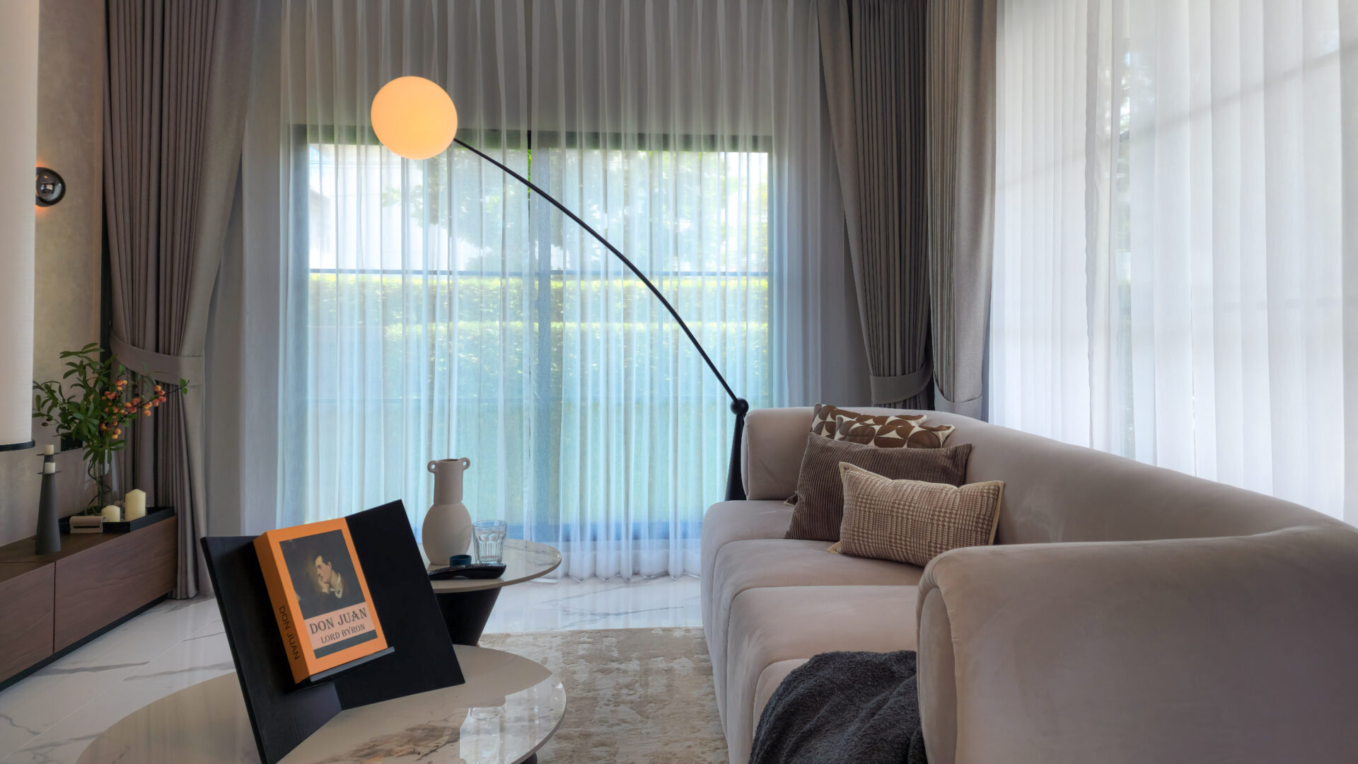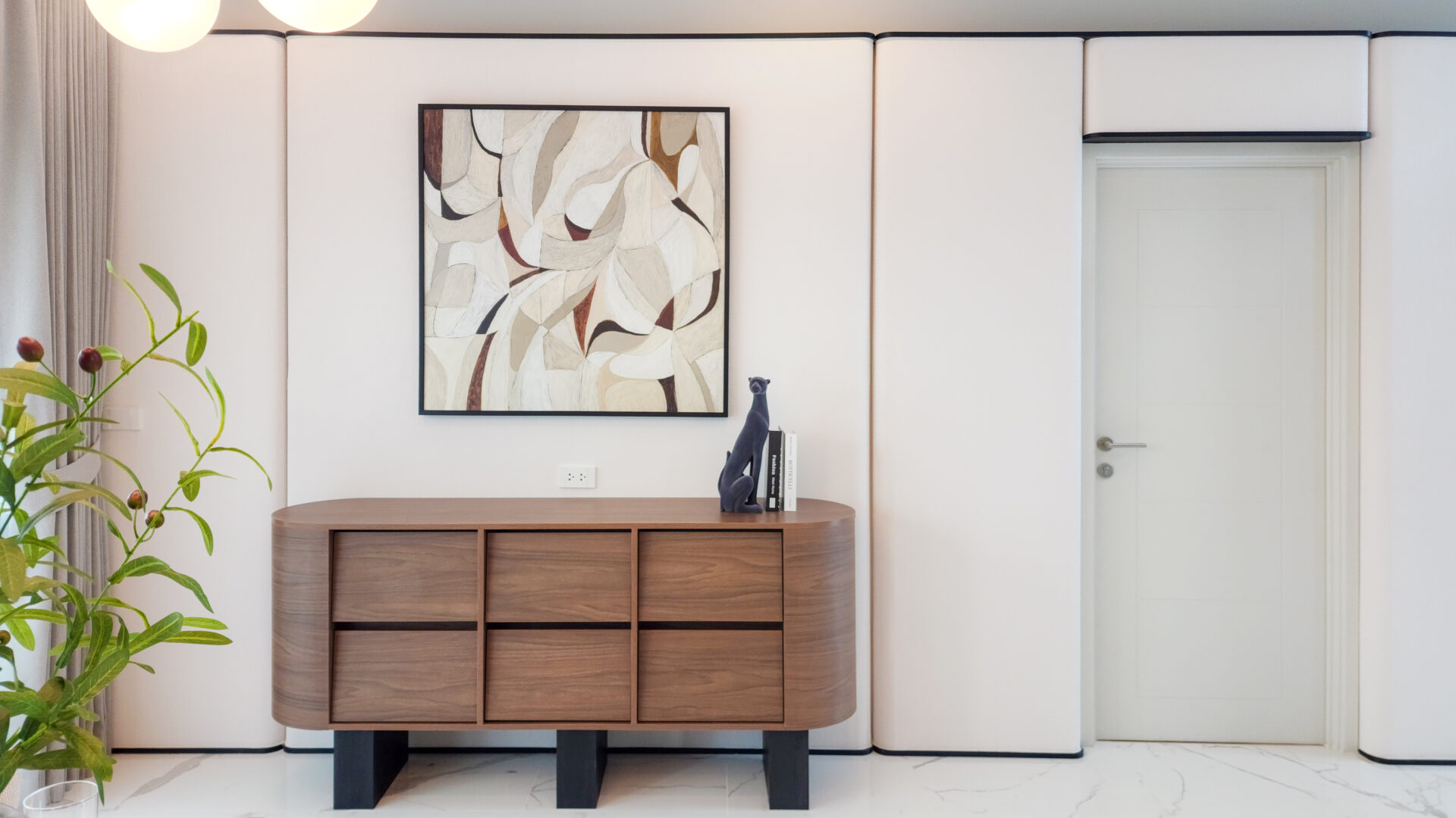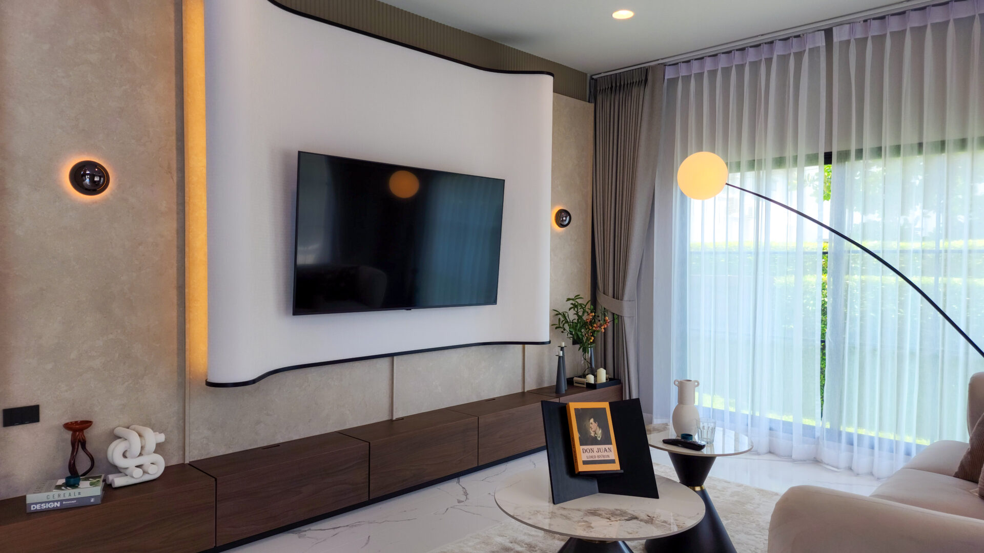 ผนังและคอนโซลทีวีถูกออกแบบด้วยเส้นโค้งนุ่มตา เพิ่มความพลิ้วไหวให้พื้นที่ดูผ่อนคลาย