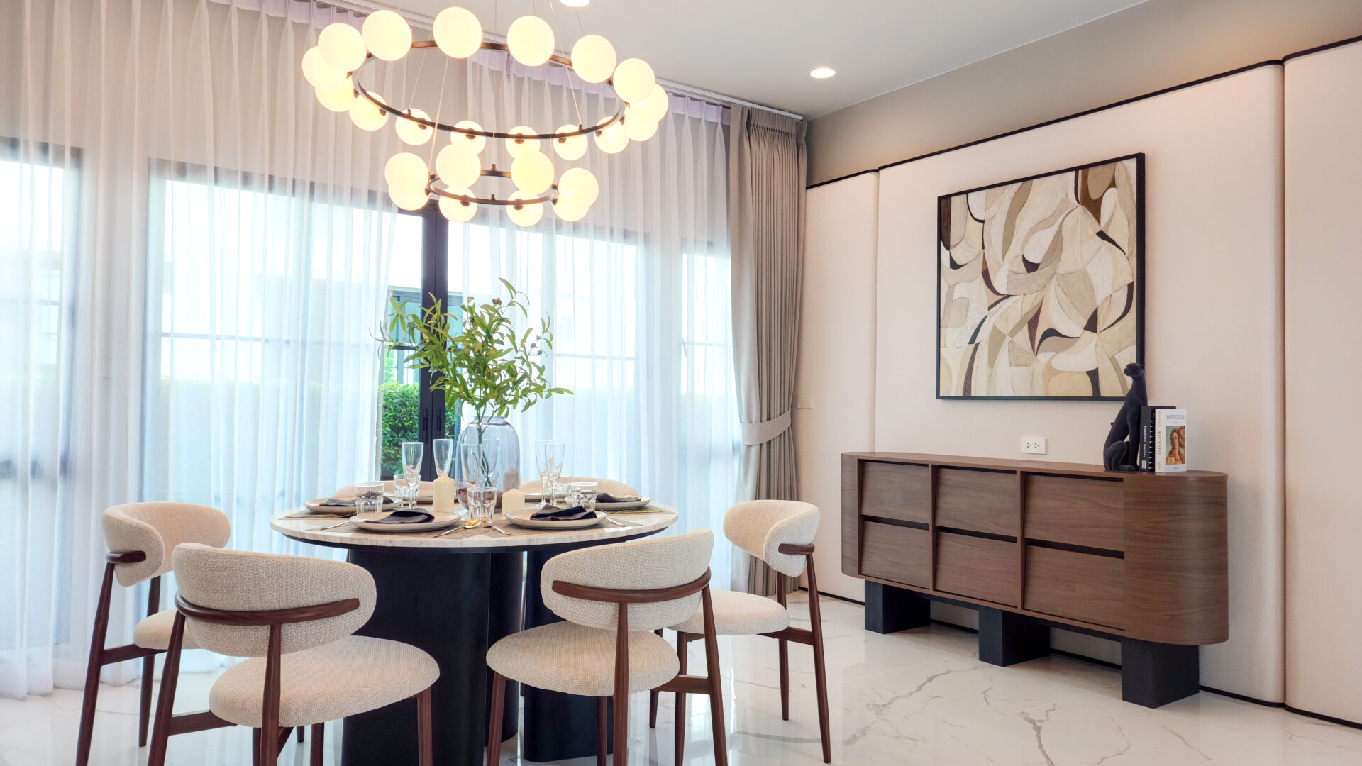 บริเวณ Dining เลือกใช้โต๊ะท็อปหินอ่อนทรงกลมและโคมไฟกลมดีไซน์เรียบ สะท้อนคาแรกเตอร์แบบ Soft Minimal + Mid-Century Touch