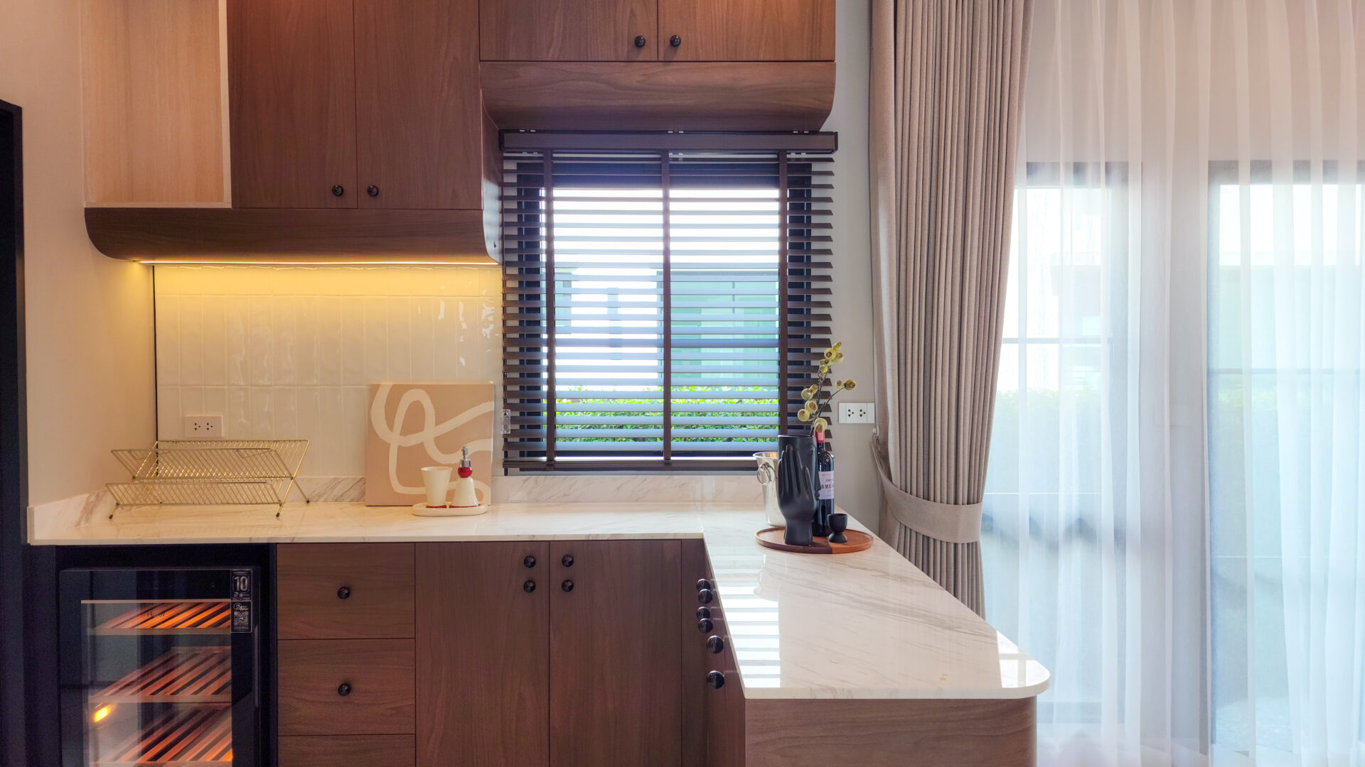 วัสดุไม้เข้มจับคู่กับหินอ่อนสีอ่อน และผ้าม่านโทนเทาอ่อนที่รับแสงธรรมชาติเต็มที่