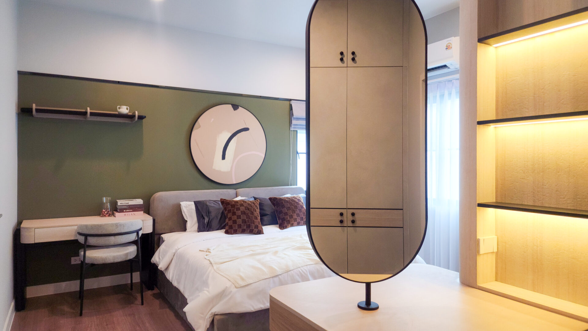 ห้องนอนนี้โดดเด่นด้วยผนังสี Olive Matte และงานศิลปะกรอบกลมที่เพิ่มความสมดุลระหว่างธรรมชาติและความหรู