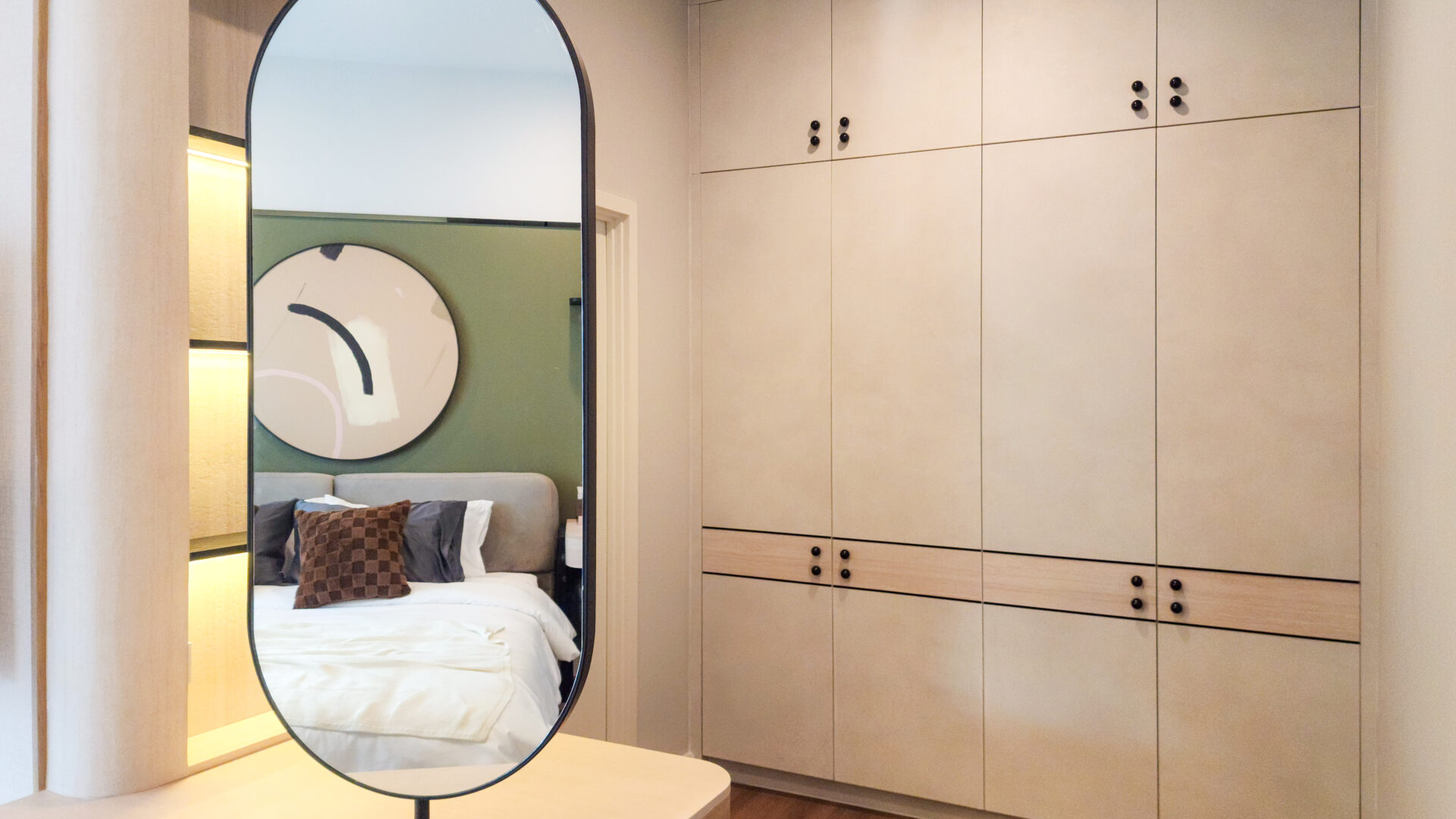 ตู้เสื้อผ้าบิ้วอินเต็มผนังพร้อมดีไซน์มือจับทรงกลมสีดำ ให้ความรู้สึกมั่นคงและโมเดิร์น