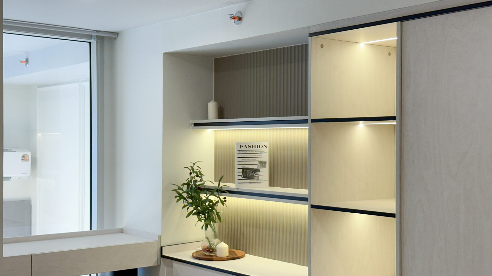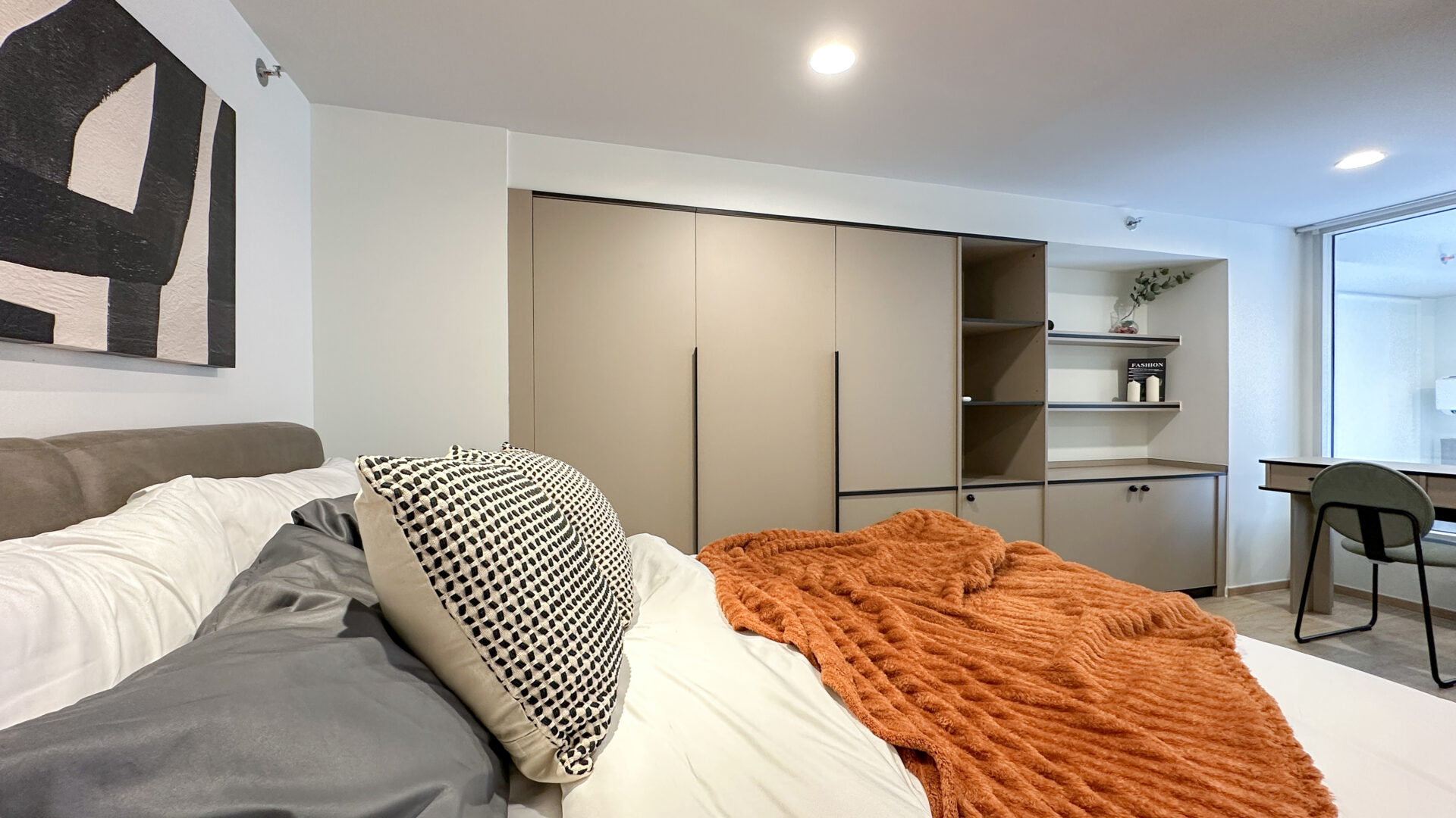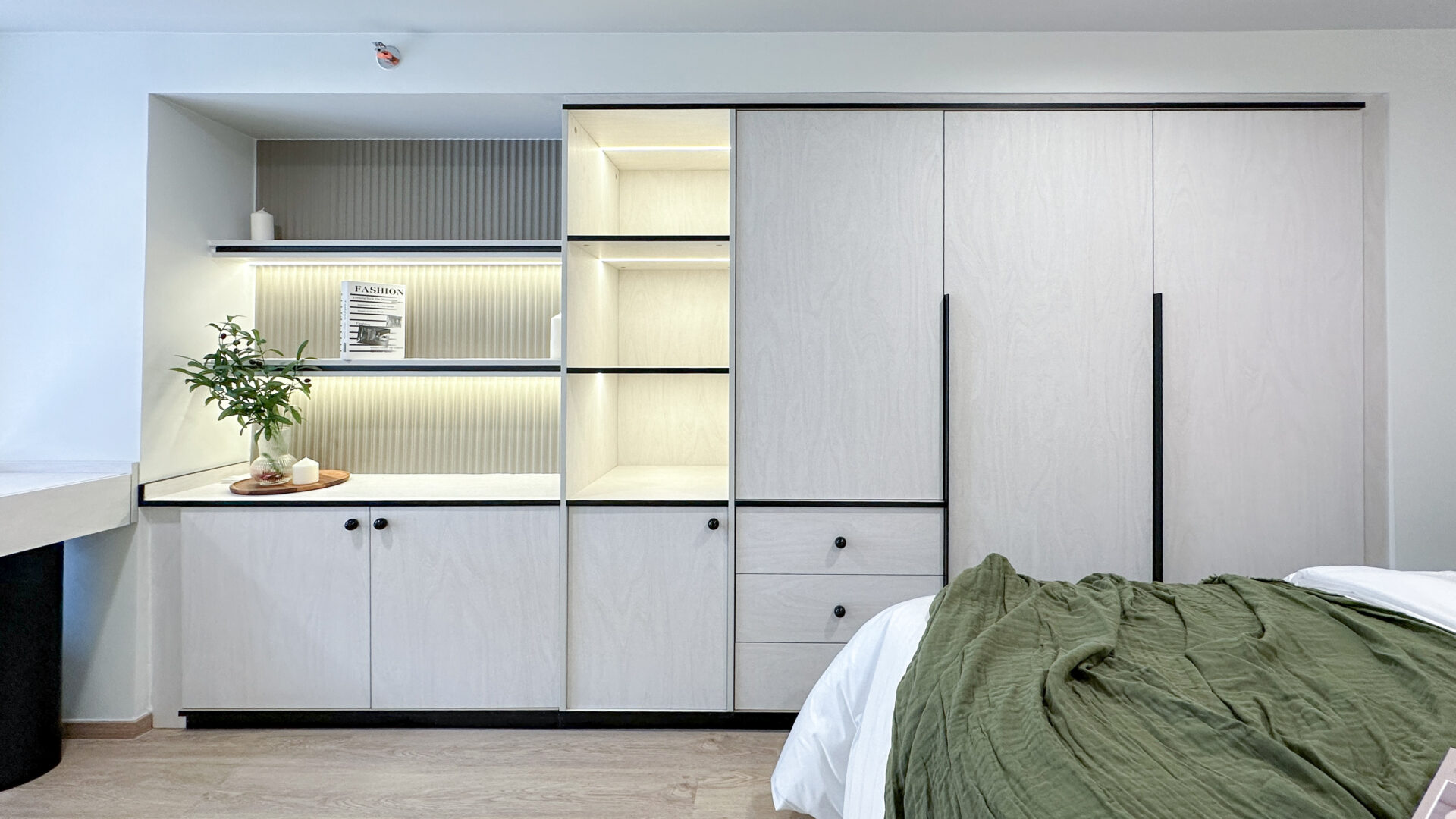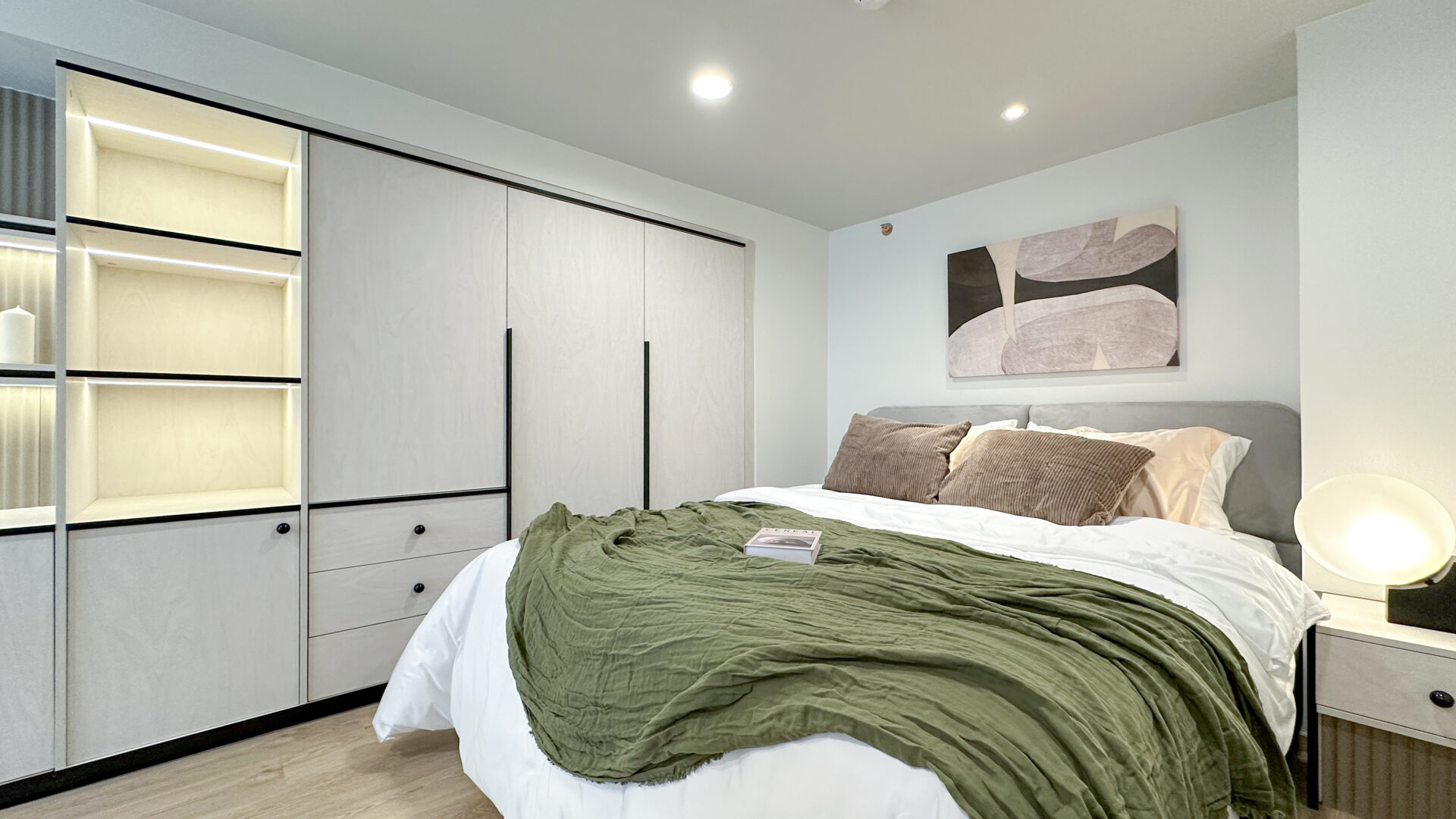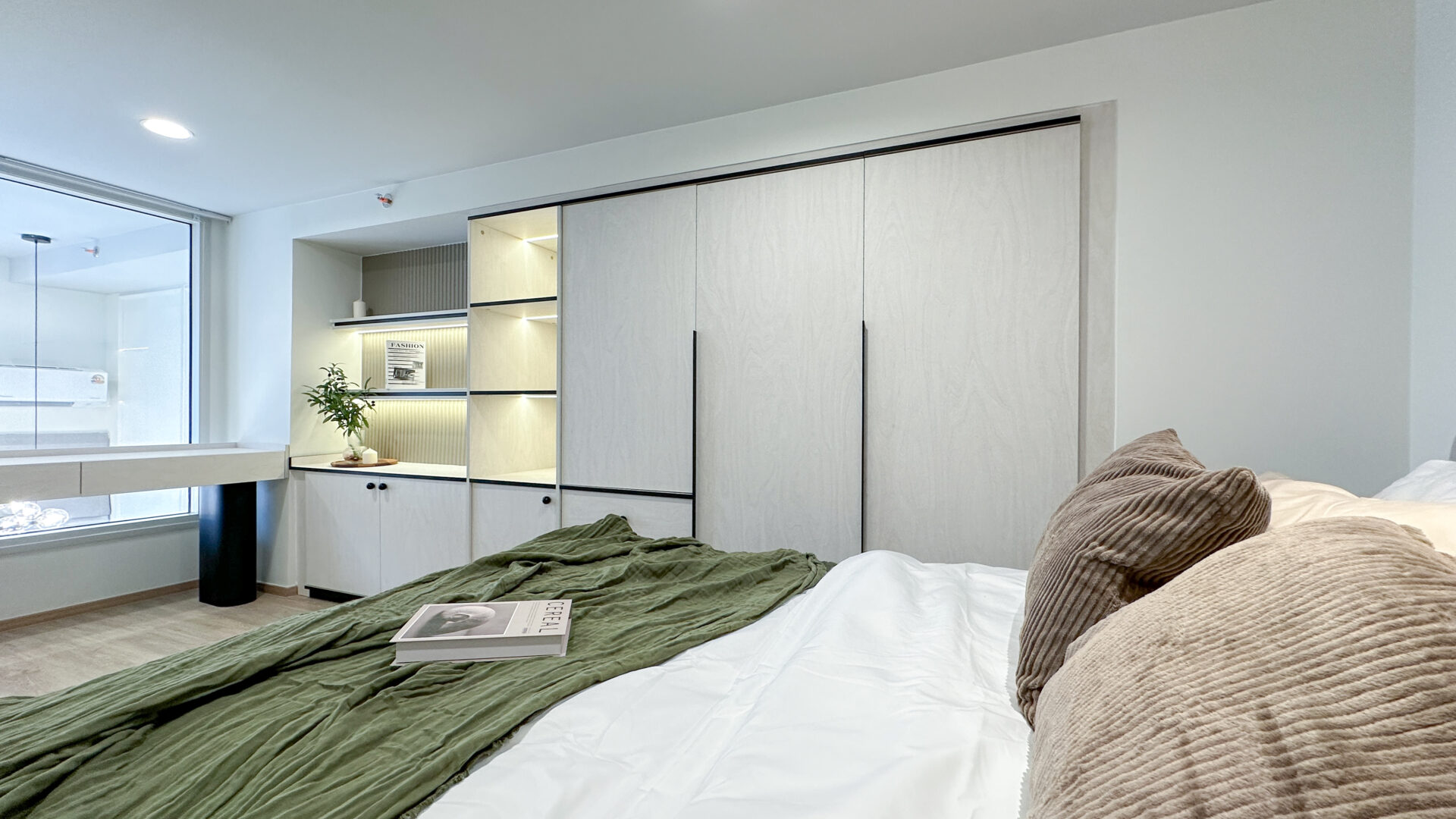 ห้องที่ตกแต่งเพื่ออยู่เอง Absolute 65 เลือกใช้โทนสีสว่างเป็นหลัก เพื่อให้คอนโดดูโปร่ง สว่าง และเป็นมิตรกับสายตา แทรกด้วยวัสดุหลากหลายอย่างมีสไตล์ ทั้งผิววัสดุที่ให้ความรู้สึกอบอุ่น และรายละเอียดเล็ก ๆ ที่น่าสนใจ เช่น การเสริมงานไฟ LED ซ่อนในตู้บิ้วอินที่มีฟังชั่นทั้งตู้เสื้อผ้า ตู้เก็บของ และคอนโซลเก็บเอกสาร เพื่อสร้างมิติของแสง — เพิ่มความรู้สึก cozy และอบอุ่นเหมาะกับการอยู่อาศัยจริง กลายเป็นมุมพักผ่อนที่เรียบง่ายแต่มีรายละเอียด