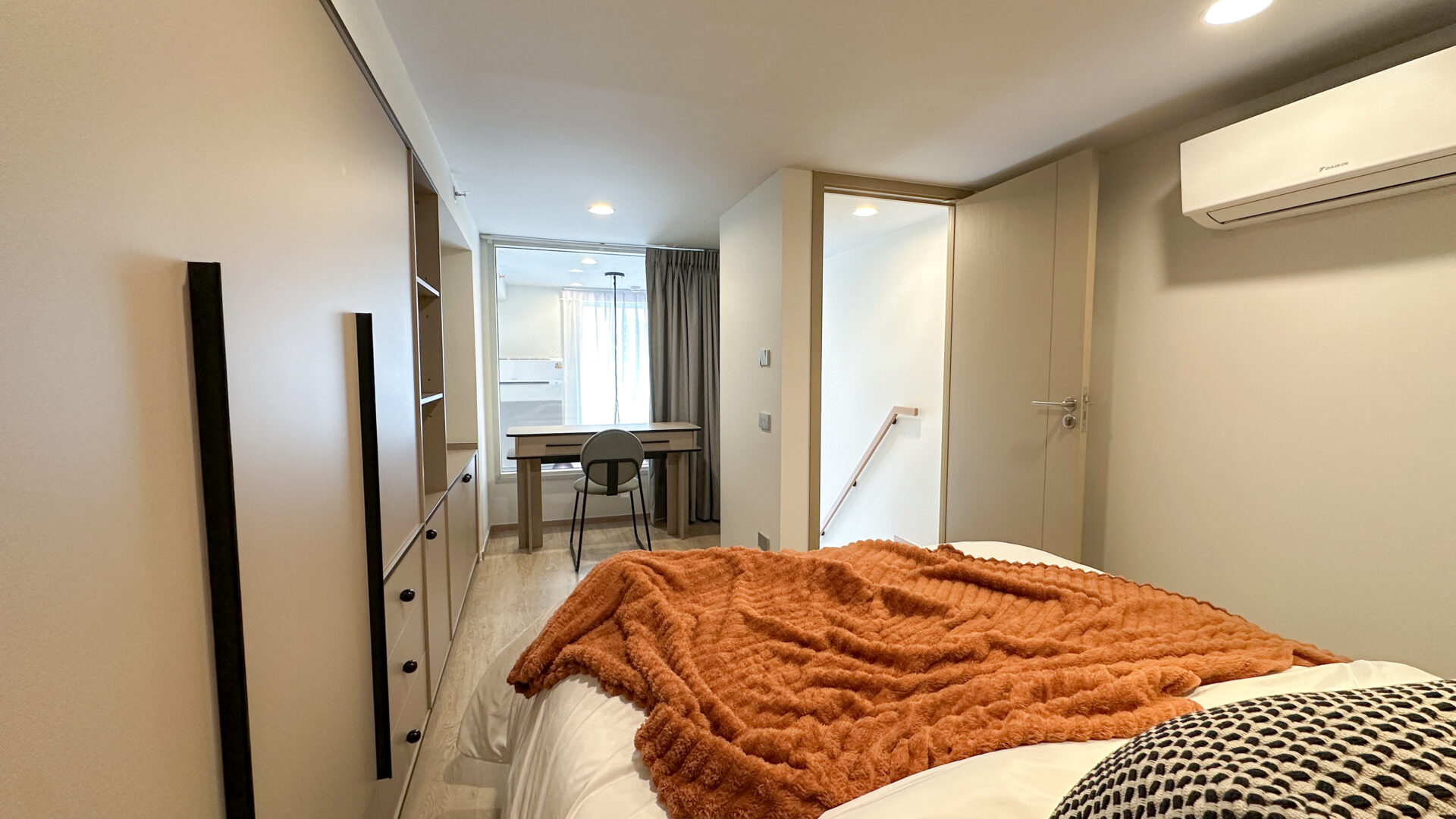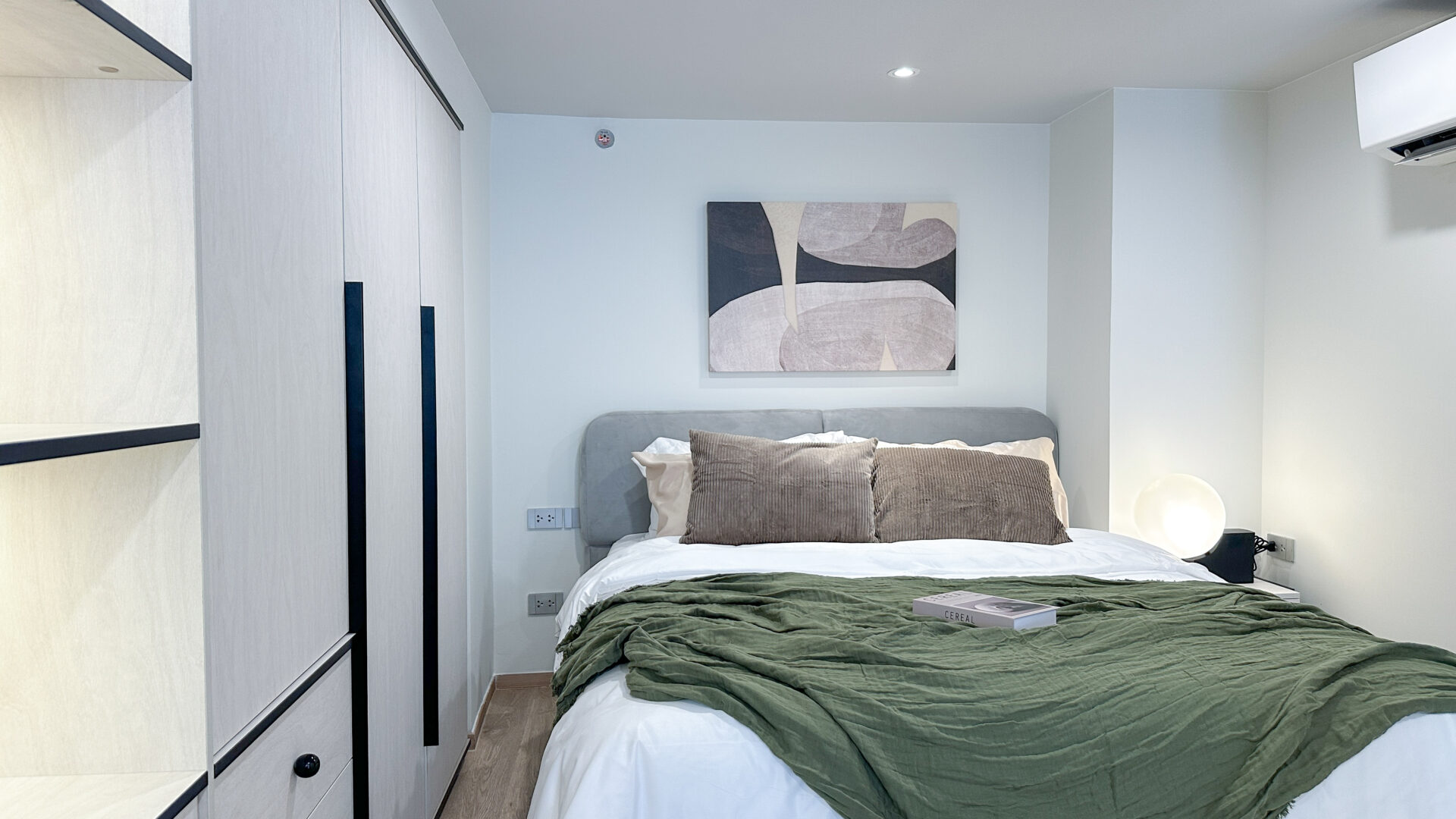 เราจึงออกแบบบิ้วอินตู้เสื้อผ้าและพื้นที่เก็บของให้ครบ — เพื่อให้ผู้เช่าสามารถเก็บของได้เยอะโดยไม่รู้สึกอึดอัด และเพิ่ม head‑space ใช้งานให้คุ้มในทุกตารางเมตร รวมถึงการจัด layout ให้ฟังก์ชันของห้องครบ โดยเน้นเฉพาะห้องนอนบนชั้นลอย
