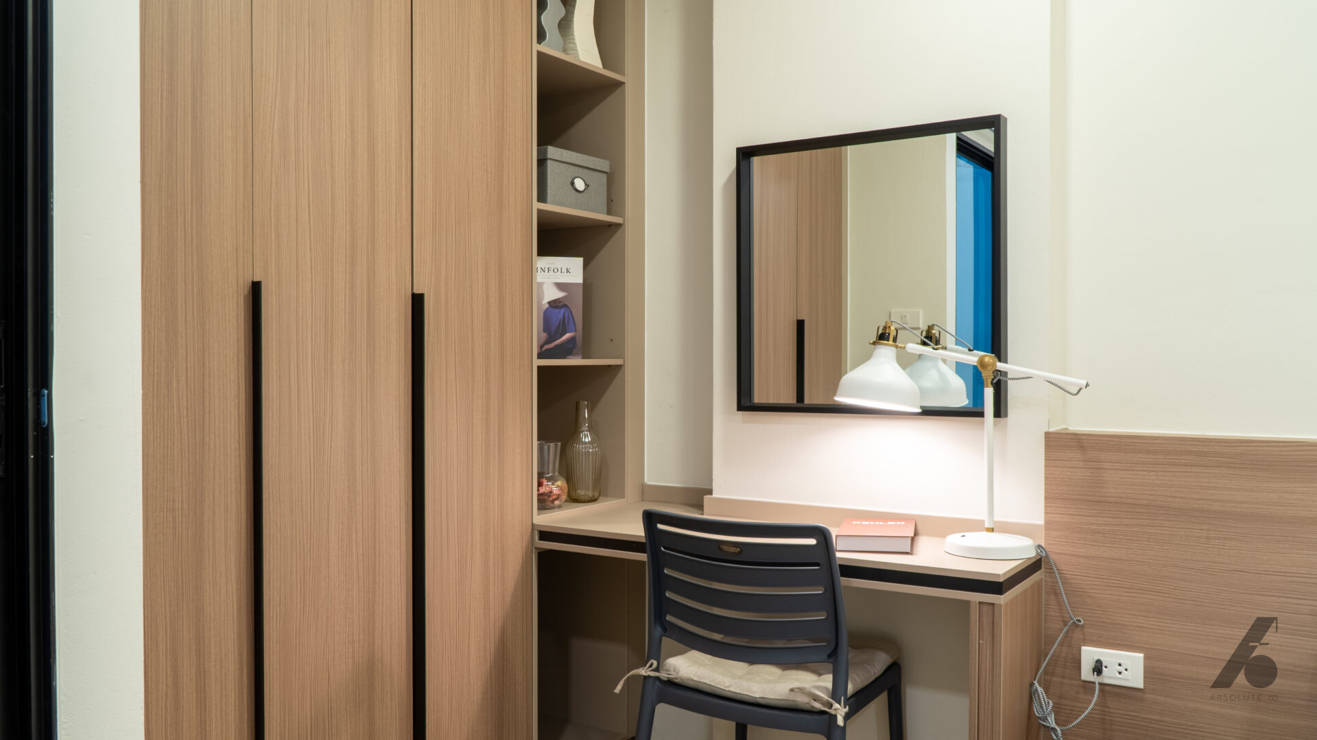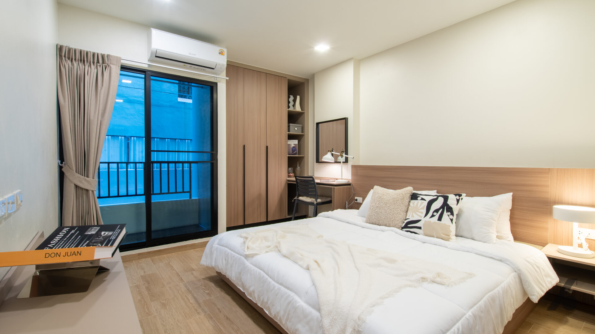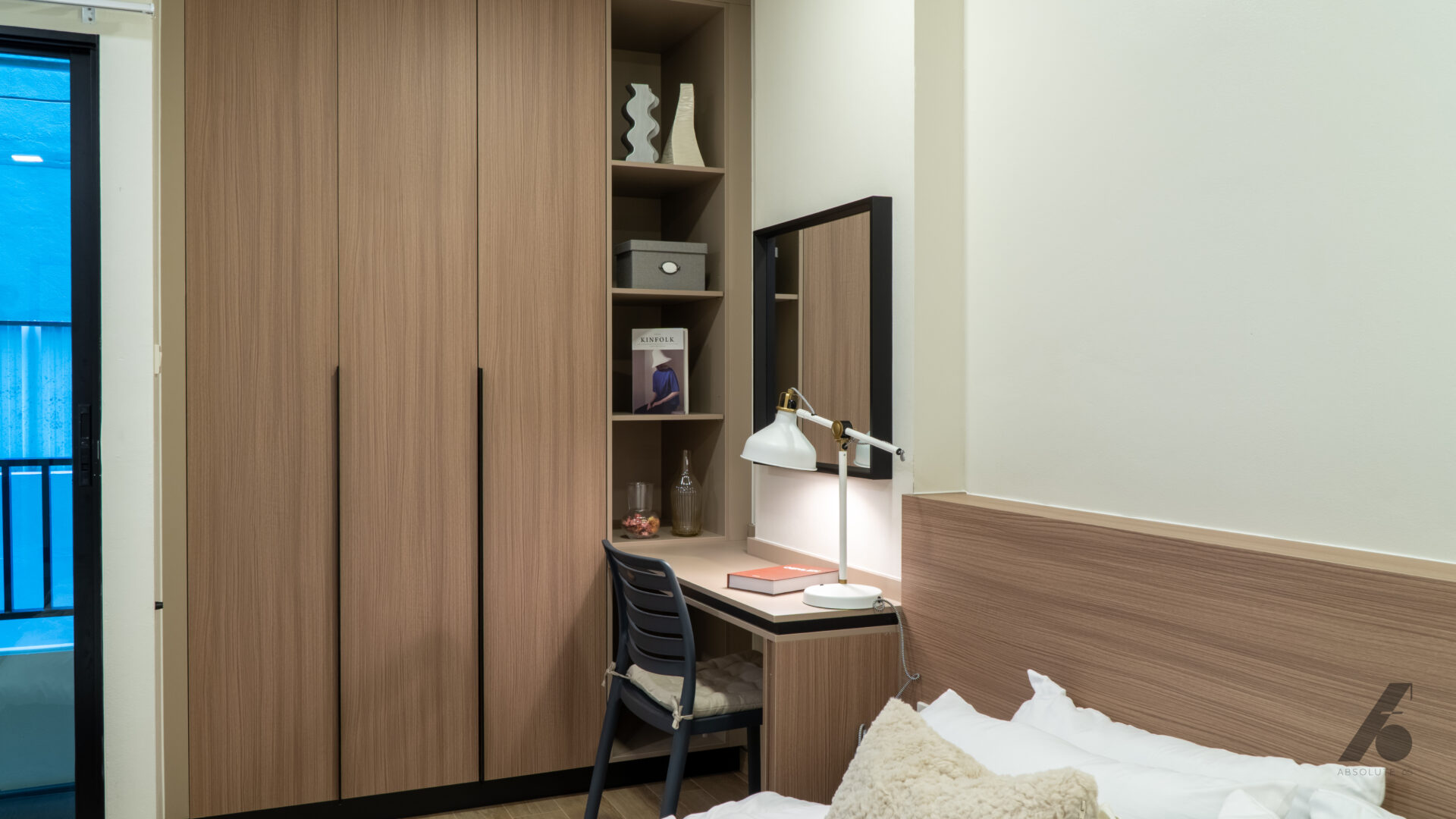 ห้องที่บิ้วอินมาทั้งหมดช่วยให้ผู้อยู่รู้สึกได้ว่า “ไม่ต้องมาจัดอะไรเพิ่มแล้ว” แค่ย้ายกระเป๋าเข้ามา ทุกอย่างก็พร้อมอยู่ — ไม่ต้องมองหาที่แขวนผ้า ที่เก็บของ หรือโต๊ะทำงานเพิ่ม เพราะถูกวางมาอย่างพอดีตั้งแต่แรก