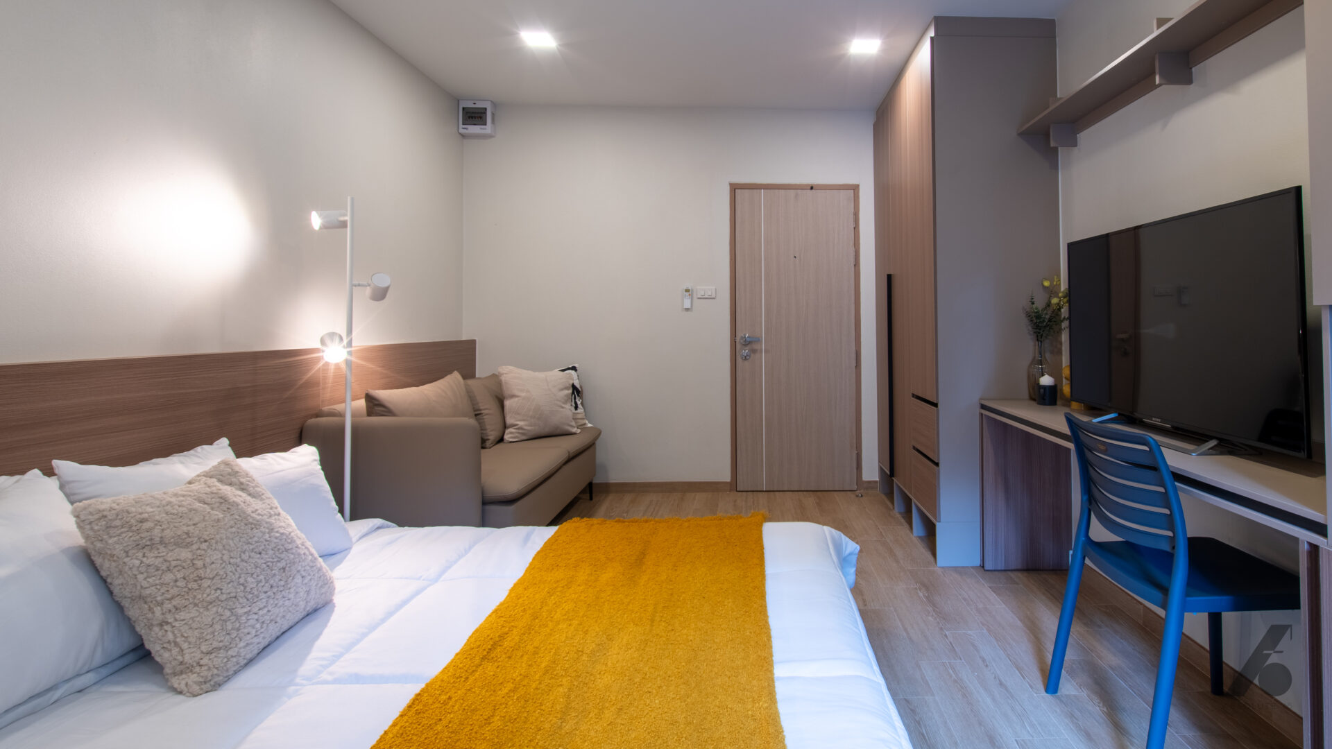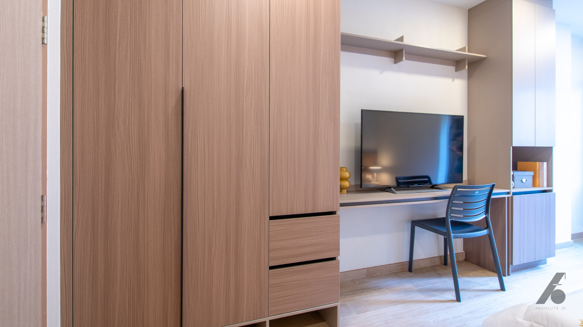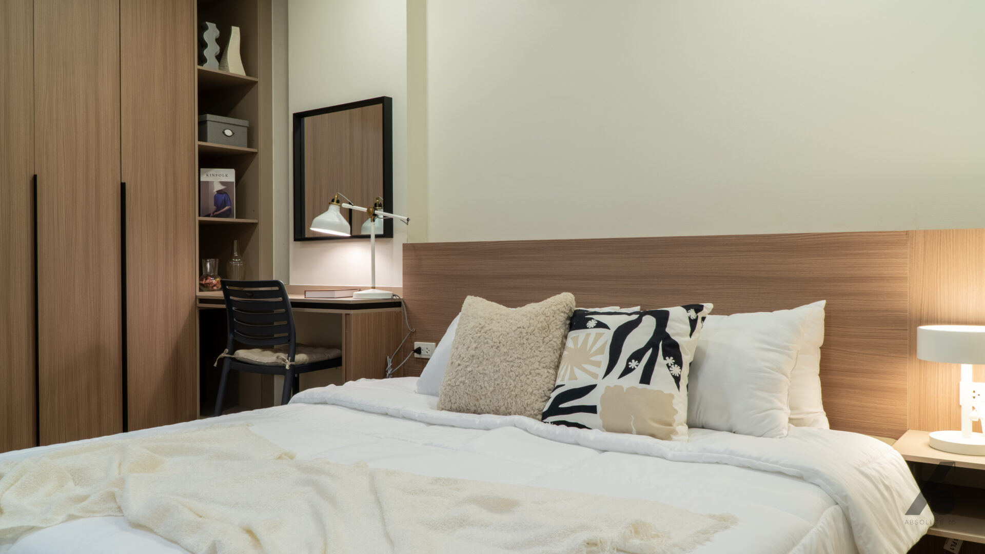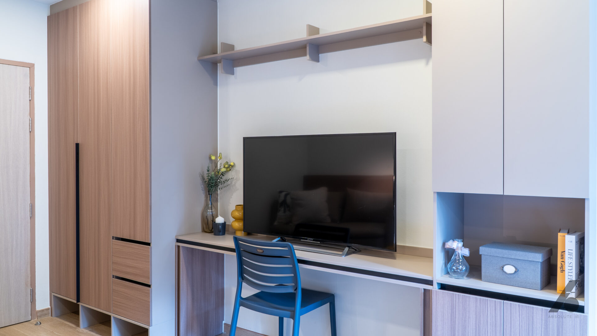 ห้องที่บิ้วอินมาทั้งหมดช่วยให้ผู้อยู่รู้สึกได้ว่า “ไม่ต้องมาจัดอะไรเพิ่มแล้ว” แค่ย้ายกระเป๋าเข้ามา ทุกอย่างก็พร้อมอยู่ — ไม่ต้องมองหาที่แขวนผ้า ที่เก็บของ หรือโต๊ะทำงานเพิ่ม เพราะถูกวางมาอย่างพอดีตั้งแต่แรก