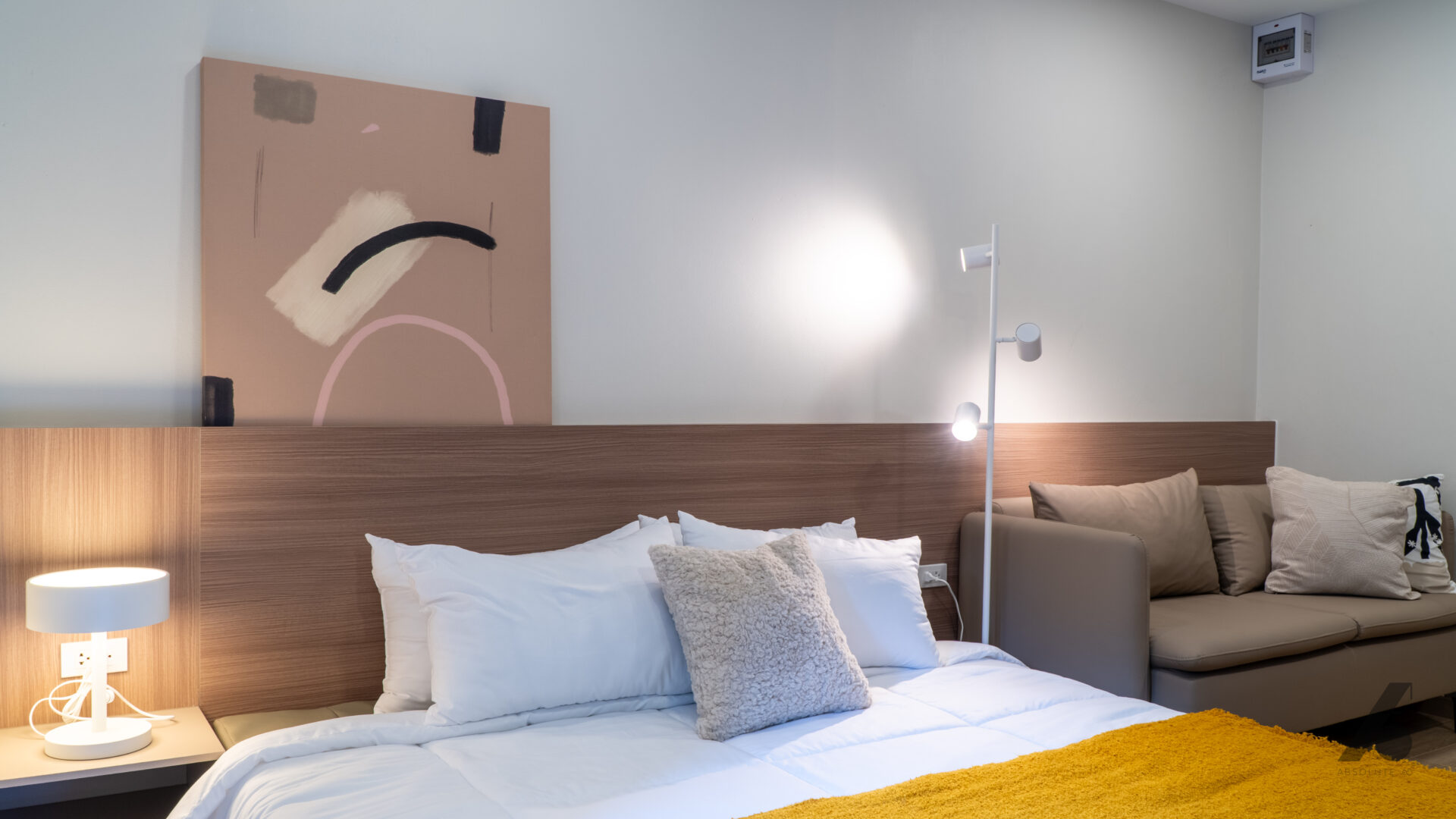 เริ่มจาก หัวเตียงบิ้วอิน ที่ยาวเต็มผนัง ไม่ใช่เพื่อความหรู แต่เพื่อให้ห้องดูมีแกนสายตา และเป็นมุมพักที่ดูอบอุ่น