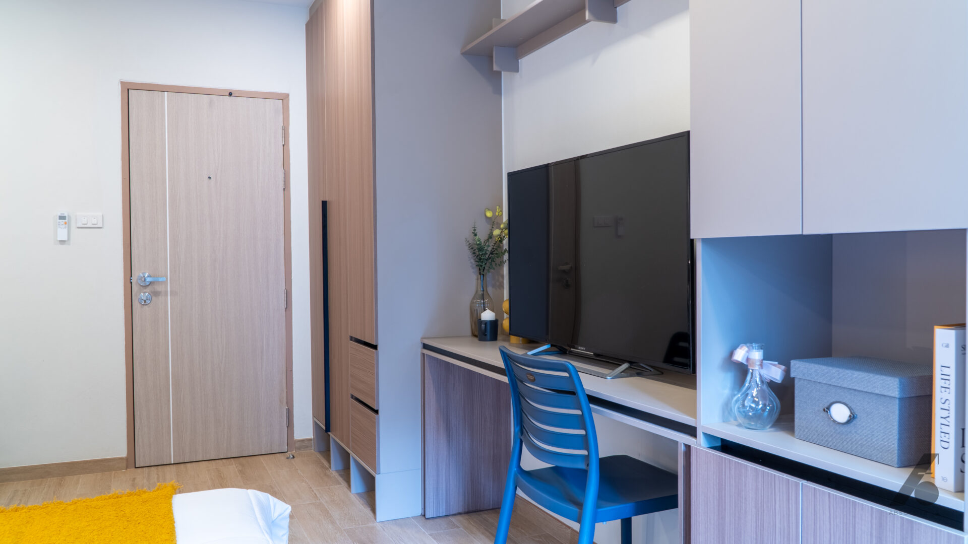 เราจึงเลือกใช้แนวทางการตกแต่งแบบ Fully Built-in ทั้งหมด โดยออกแบบเฟอร์นิเจอร์ให้ตอบรับกับชีวิตจริงของผู้เช่าในห้องขนาดประมาณ 20-24 ตร.ม.